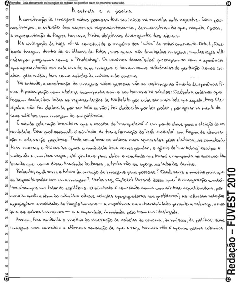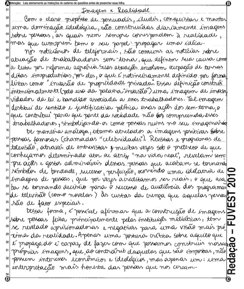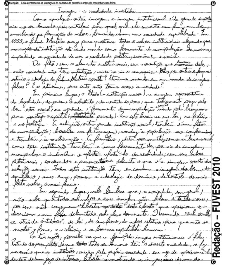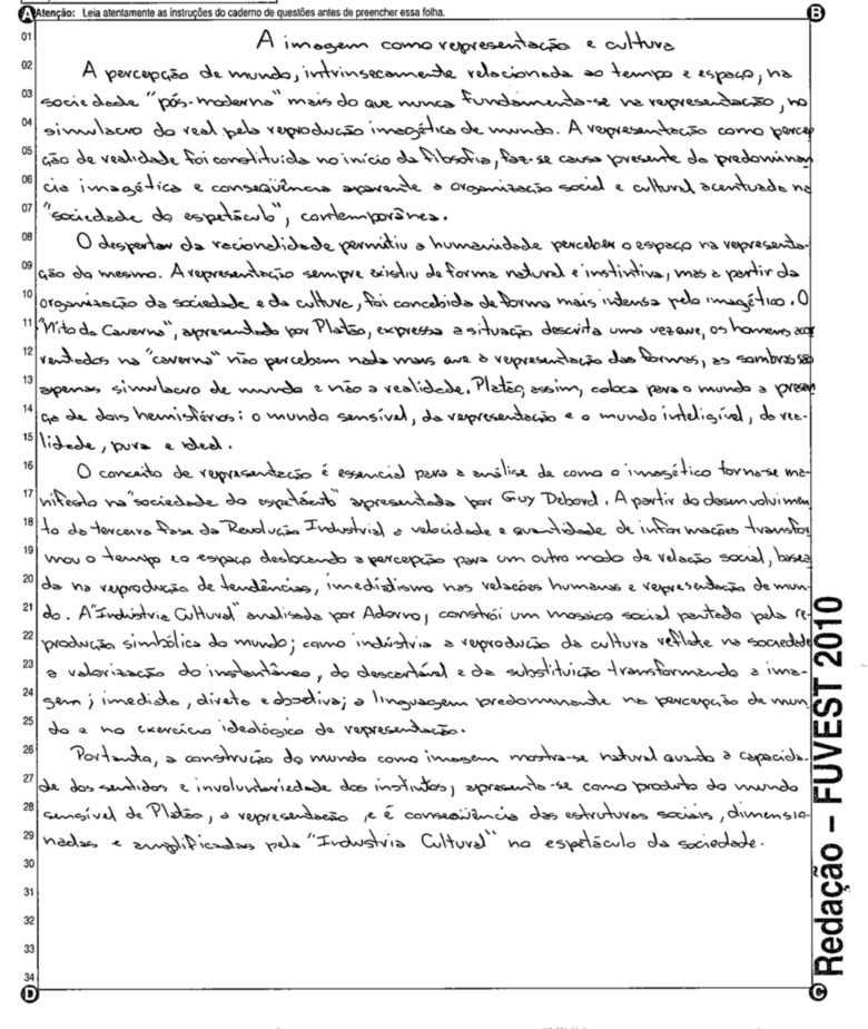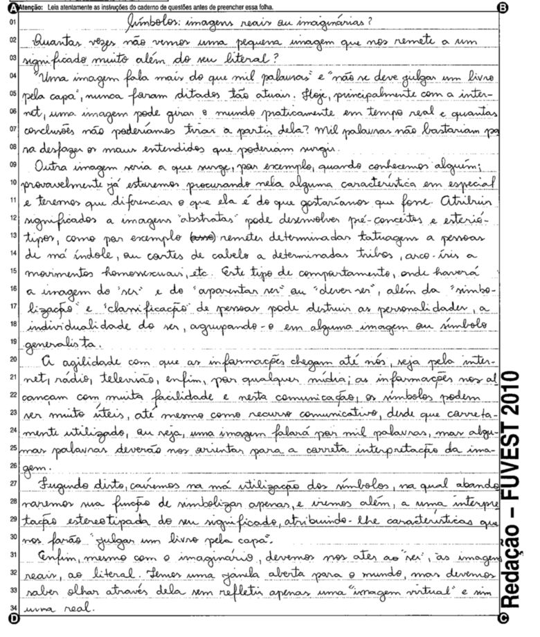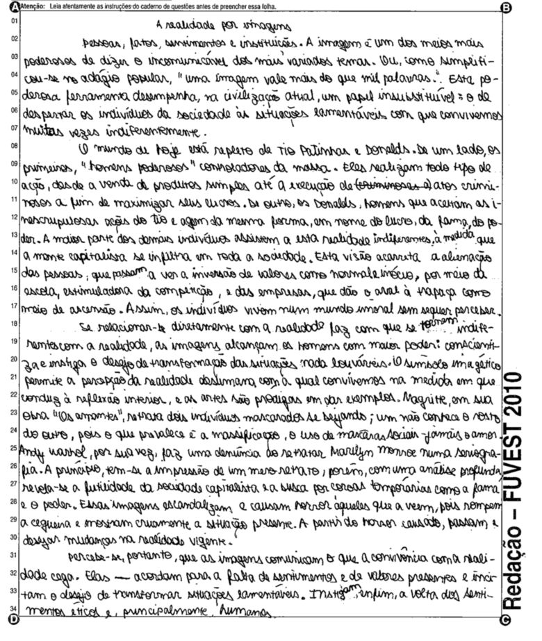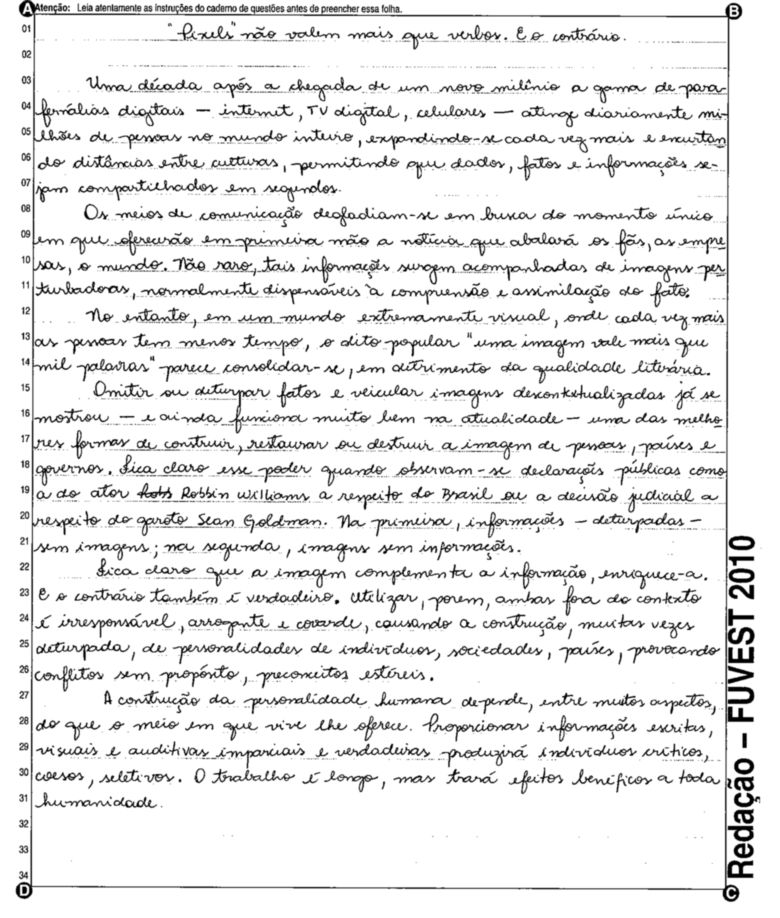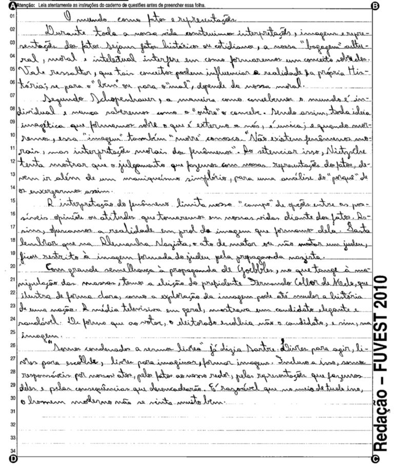 A Fuvest (Fundação Universitária para o Vestibular) liberou nesta terça-feira, 11, as 53 melhores redações do Vestibular 2010. A instituição seleciona alunos da Universidade de São Paulo (USP), da Faculdade de Ciências Médicas da Santa Casa de São Paulo e da Academia da Polícia Militar do Estado de São Paulo. O tema foi "O mundo por imagens".