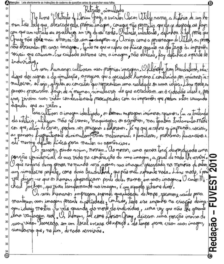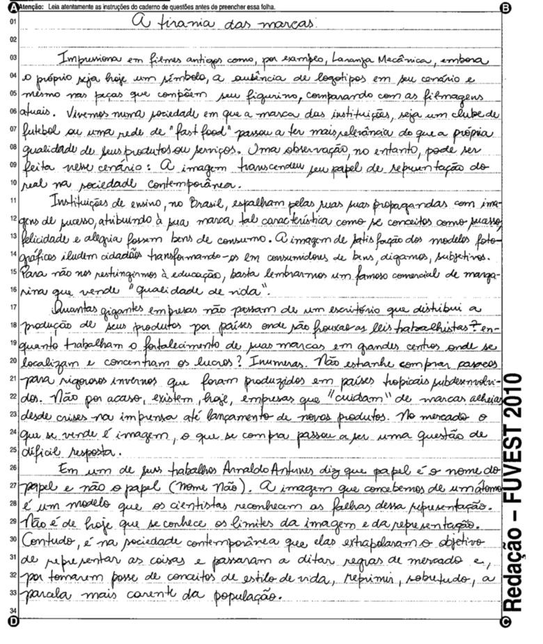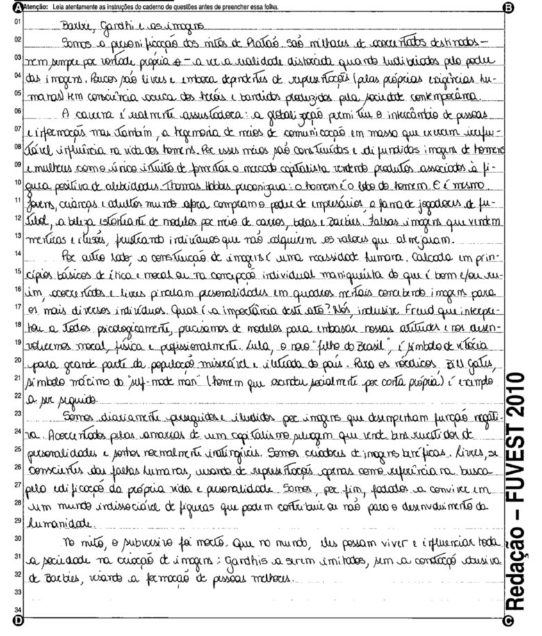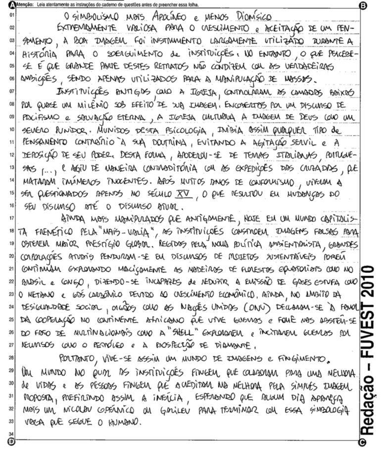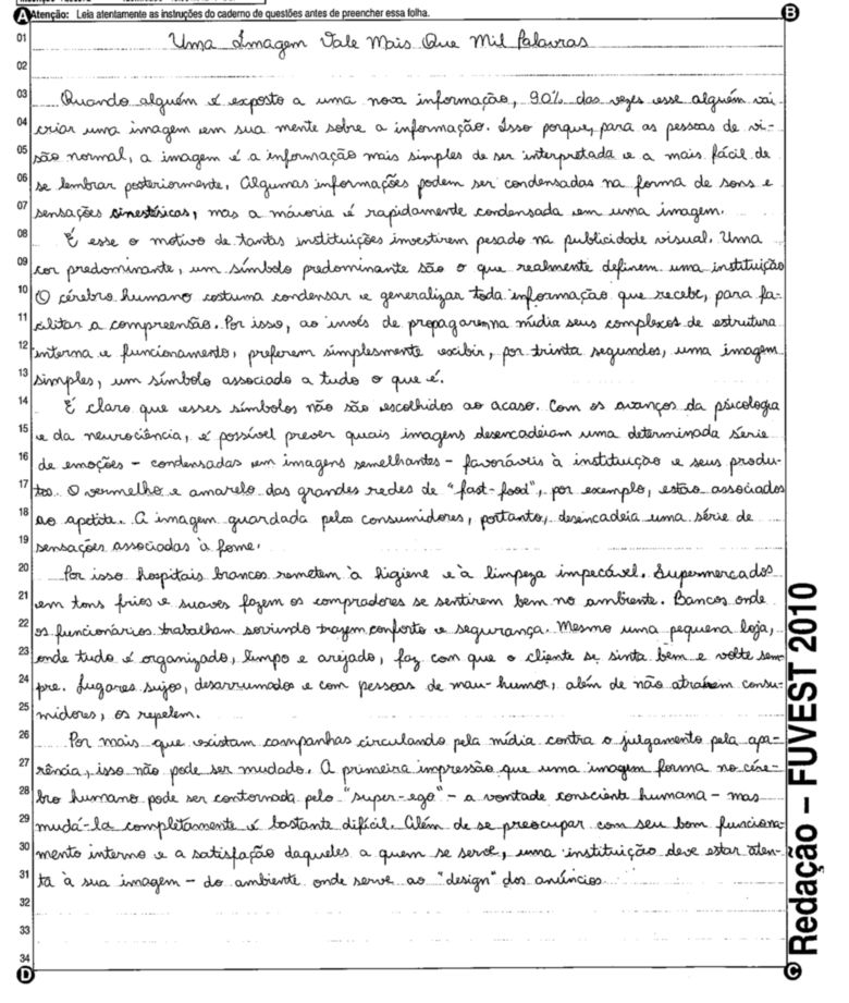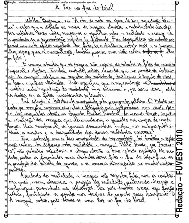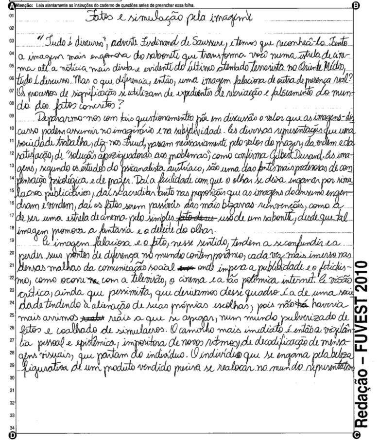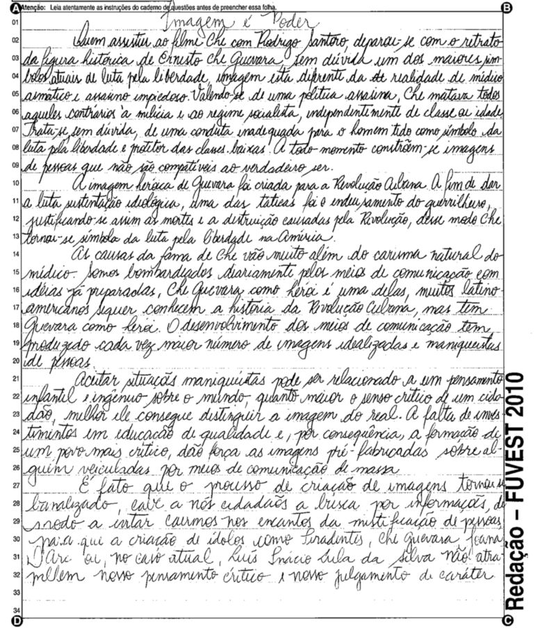 A Fuvest (Fundação Universitária para o Vestibular) liberou nesta terça-feira, 11, as 53 melhores redações do Vestibular 2010. A instituição seleciona alunos da Universidade de São Paulo (USP), da Faculdade de Ciências Médicas da Santa Casa de São Paulo e da Academia da Polícia Militar do Estado de São Paulo. O tema foi "O mundo por imagens".