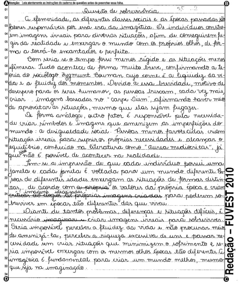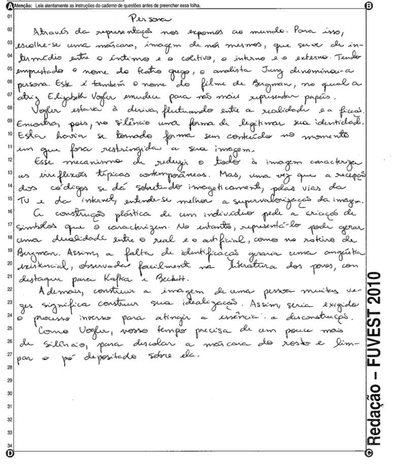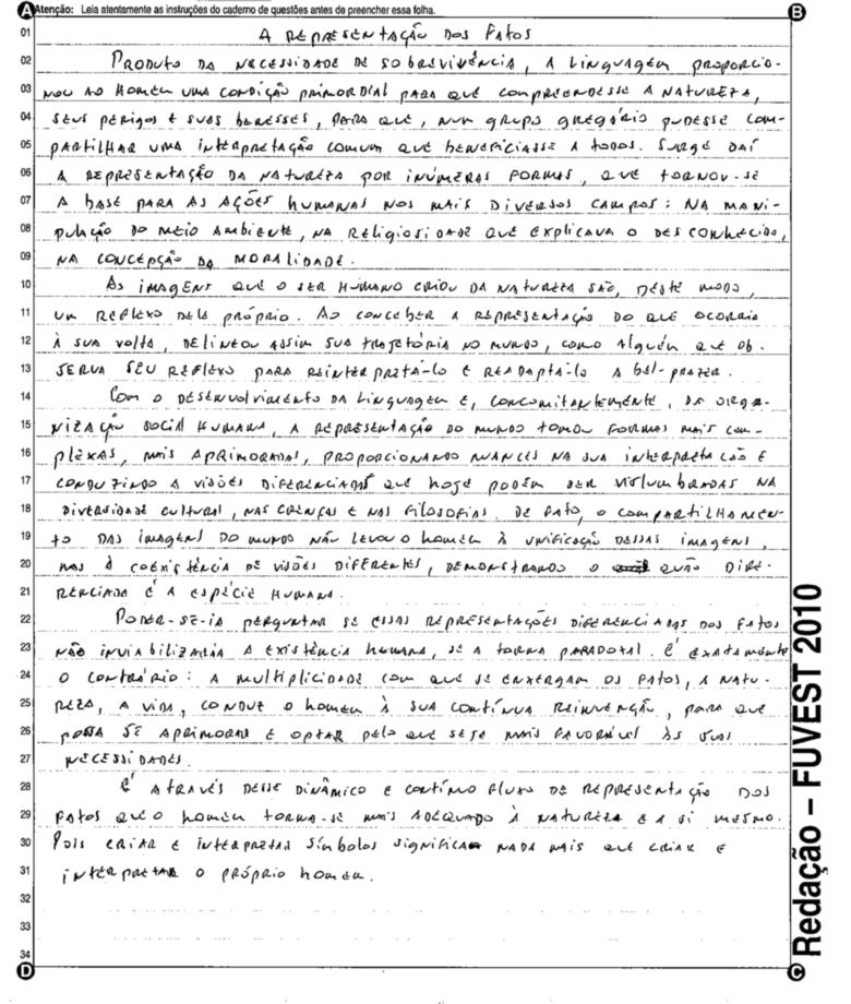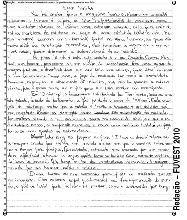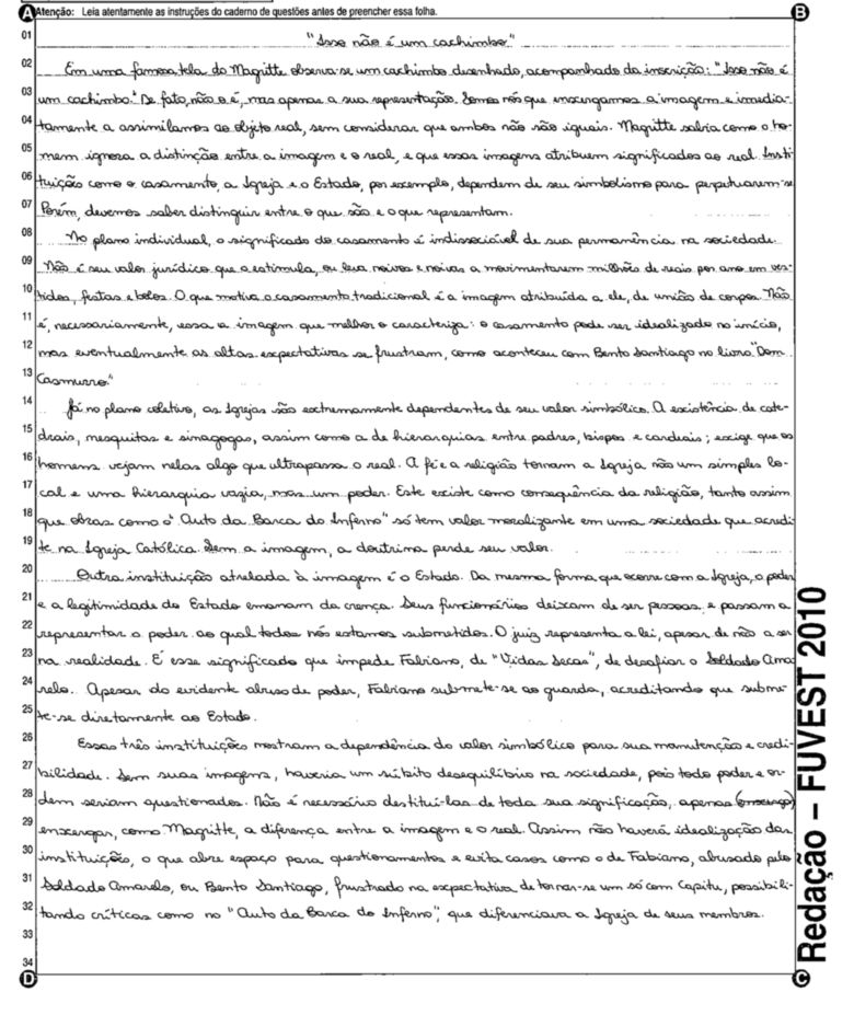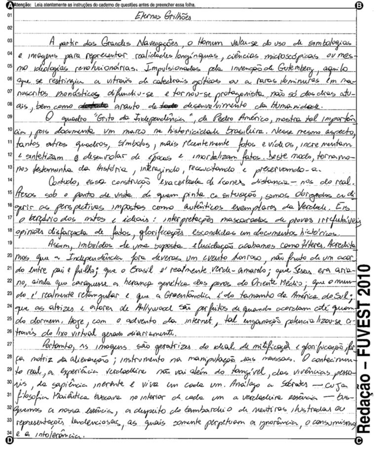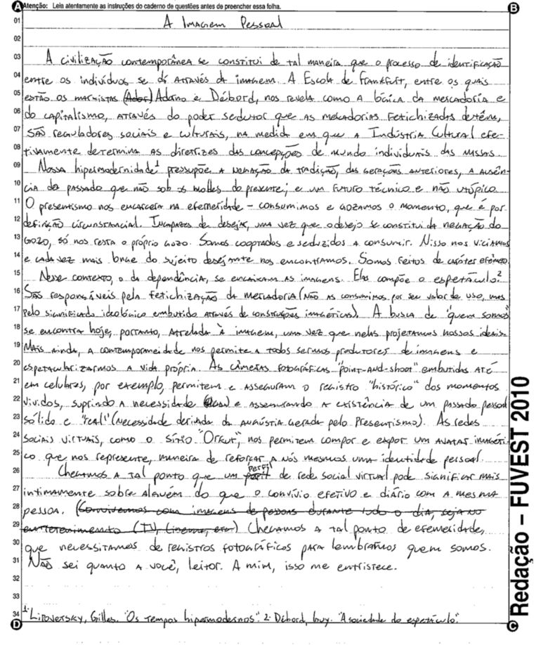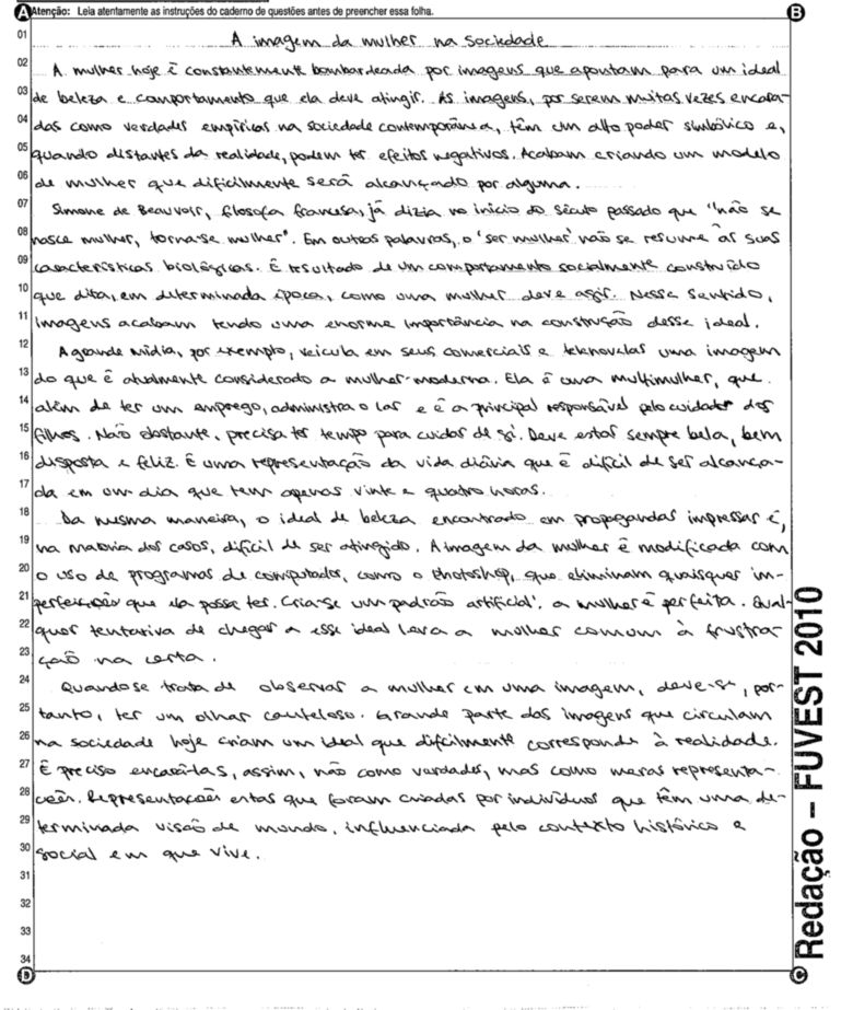 A Fuvest (Fundação Universitária para o Vestibular) liberou nesta terça-feira, 11, as 53 melhores redações do Vestibular 2010. A instituição seleciona alunos da Universidade de São Paulo (USP), da Faculdade de Ciências Médicas da Santa Casa de São Paulo e da Academia da Polícia Militar do Estado de São Paulo. O tema foi "O mundo por imagens".