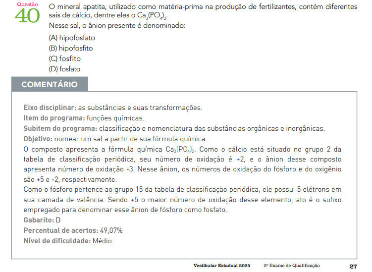 Diferente de outras universidades, a UERJ não só publica o gabarito das provas, mas, também, comentários sobre cada uma das perguntas, mostrando ao estudante qual seria o caminho adequado para chegar à alternativa correta.